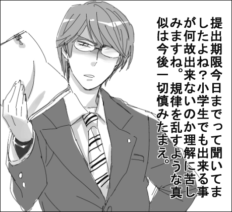 最初「なんで遅れるのよーもー!」みたいな、恋愛ゲームの学級委員長みたいなノリで描いてたんですが、なんか気持ち悪くて、テンション落として蔑ませたら超しっくりきました。